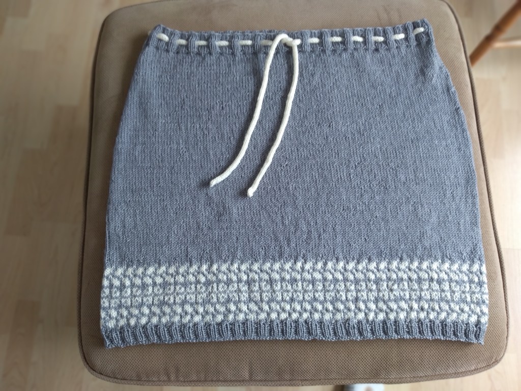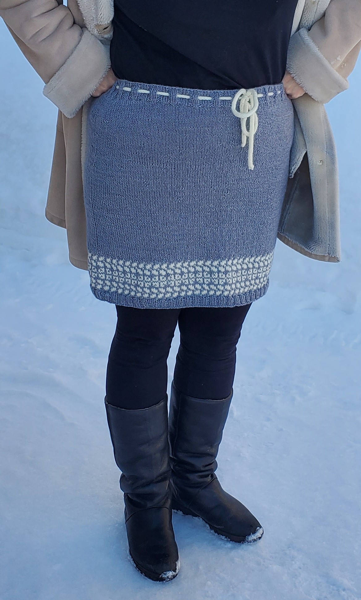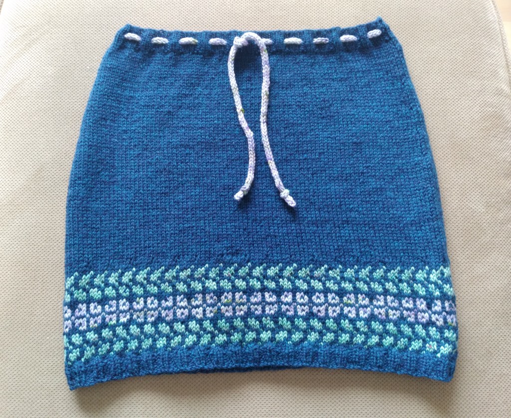 La laine est de la laine fine, no 1 (fingering) et ça prend moins de laine que pour un chandail. La jupe est tricotée en rond, avec une aiguille circulaire de 3.5 mm. Seule la section ceinture est avec une 3 mm. La jupe est tenue à la taille avec une corde en « i » faite avec 2 aiguilles double-pointes. J’en ai profité pour faire le cordon avec la même couleur que celle du jacquard.