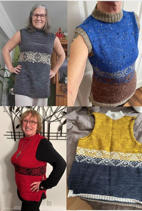 Je l’avais fait avec 3 écheveaux de 100 g de laine des fibres fantastiques (qui ne se vend plus). Mes 3 écheveaux étaient de couleurs différentes, j’ai donc 2 couleurs principales (c1 et c2), et la contrastante, il m’en est resté pas mal. Quelques testeuses l’ont fait avec une seule couleur principale, ce que j’espérais pour qu’on voit l’effet ainsi. Donc le patron permet les 2 options: uni avec une contrastante, ou avec 3 couleurs. Si comme moi vous avez 3 écheveaux solitaires qui iraient bien ensembles, c’est possible (mais seulement pour les tailles grand et moins, si on n’a que nos 3 écheveaux).