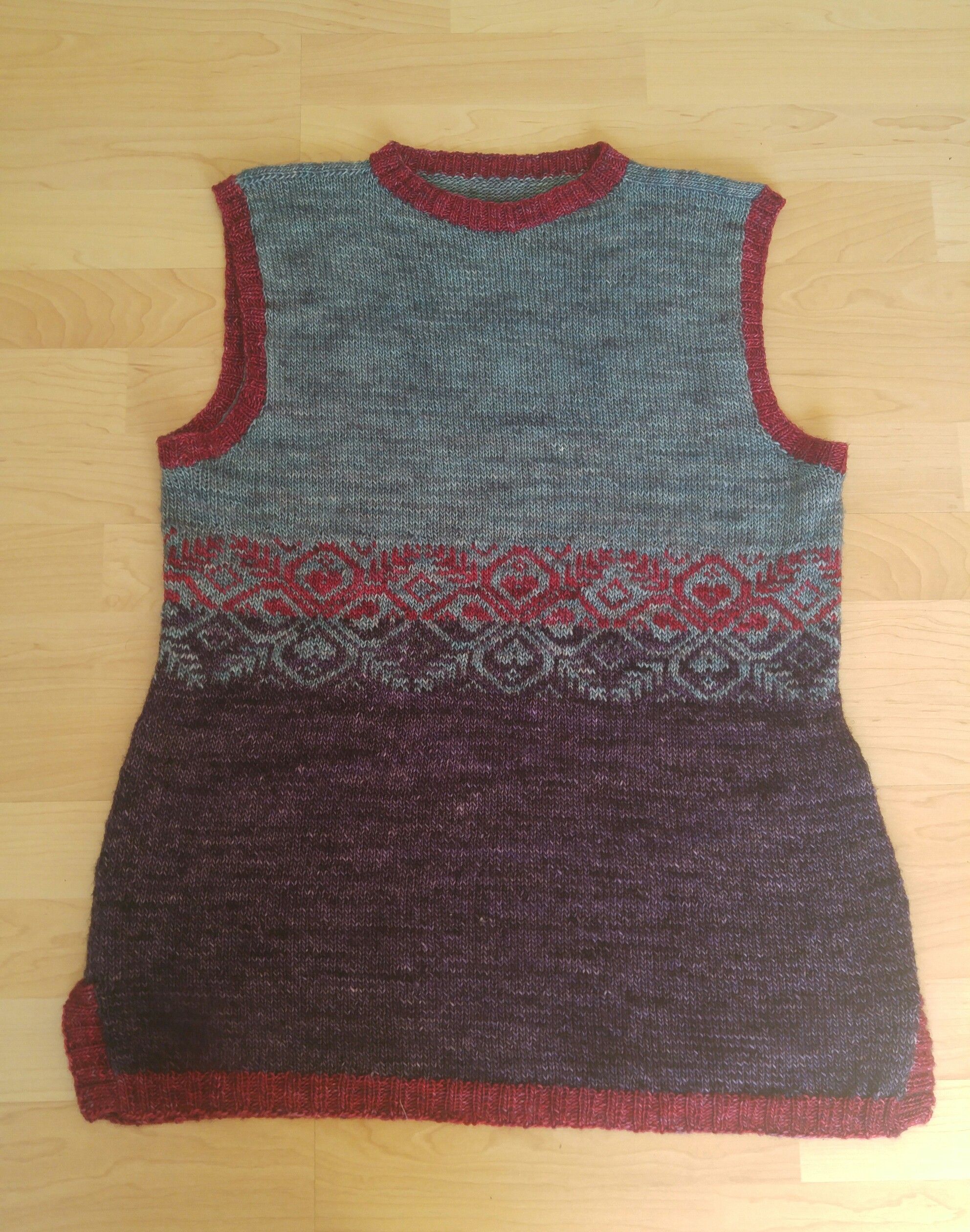 C’est fait en laine fine (fingering), c’est plus long qu’un débardeur normal (d’où le nom « tunique »). Elle a plus d’ampleur aux hanches qu’au buste. Elle se tricote de haut en bas, sans coutures, avec aiguilles circulaires. Elle se porte à merveille sur un legging, ce n’est pas trop chaud: on peut même la porter sans manches