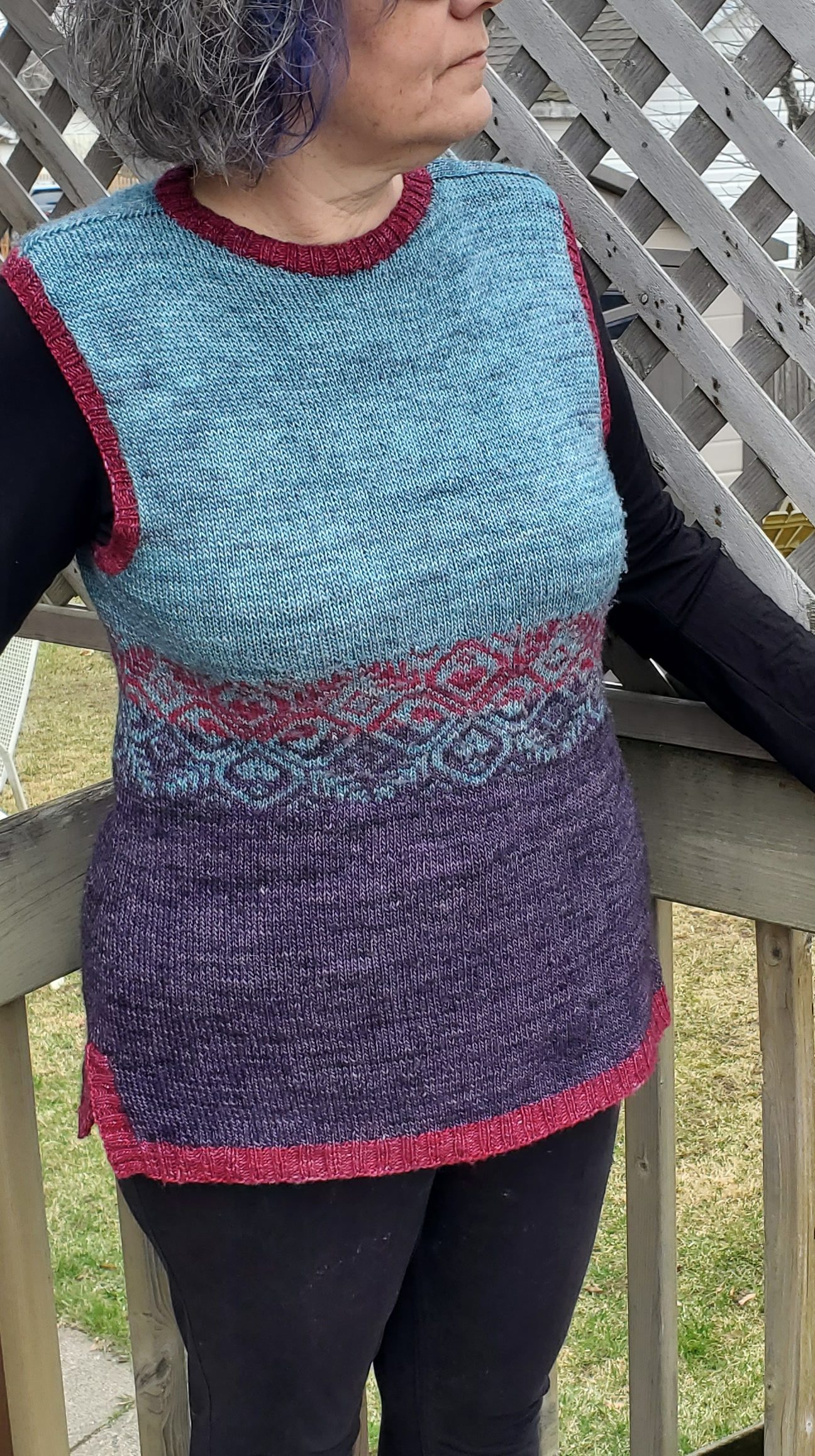 Un an plus tard, je décide de faire un débardeur avec le motif, mais ce n’est qu’en mars 2020 que je le termine. Quelques mois plus tard, je le propose en test à mon groupe courriel de testeuses mais personne n’est intéressé à le faire (c’est-à-dire 2, mais elles ont dû se désister avant même le début des tests). Habituellement, dans ces conditions, je le propose sur ma page facebook, mais je ne l’ai pas fait, pour une raison dont je ne me rappelle plus. Ah…peut-être la pandémie m’a-t-elle un brin désorganisée?