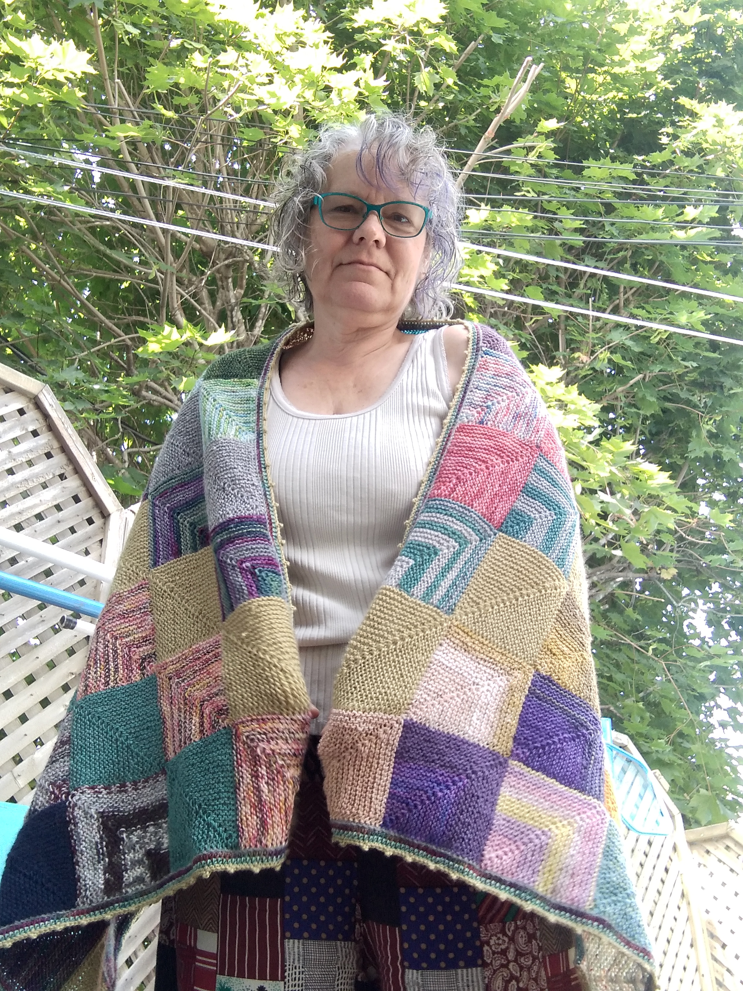 J’ai terminé une étole en tricot modulaire, faite de restes de laine à bas. Au départ, je pensais faire une couverture et j’ai décidé d’arrêter en plein milieu, alors qu’elle en était à 6 X 12 (72 modules). J’ai ajouté une rangée de modules de chaque côté, la faisant de 6 X 14 (84 modules) et c’était parfait pour une étole. Parfois je l’appelle « demie-couverture » pour son côté « restants ».