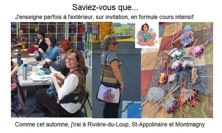 Je donne un cours à la nouvelle boutique de Lévis L’Art des Points le vendredi après-midi. Et aussi, je donne quelques samedis à l’extérieur (Montmagny, Festival de la P’tite Laine à Rivière du Loup et St-Appolinaire). Je ne pense pas que les cours du samedi vont recommencer à l’hiver. Par contre, le cours à l’Art des Points, c’est dans mon intention que ça continue, en petites sessions sur différents thèmes.