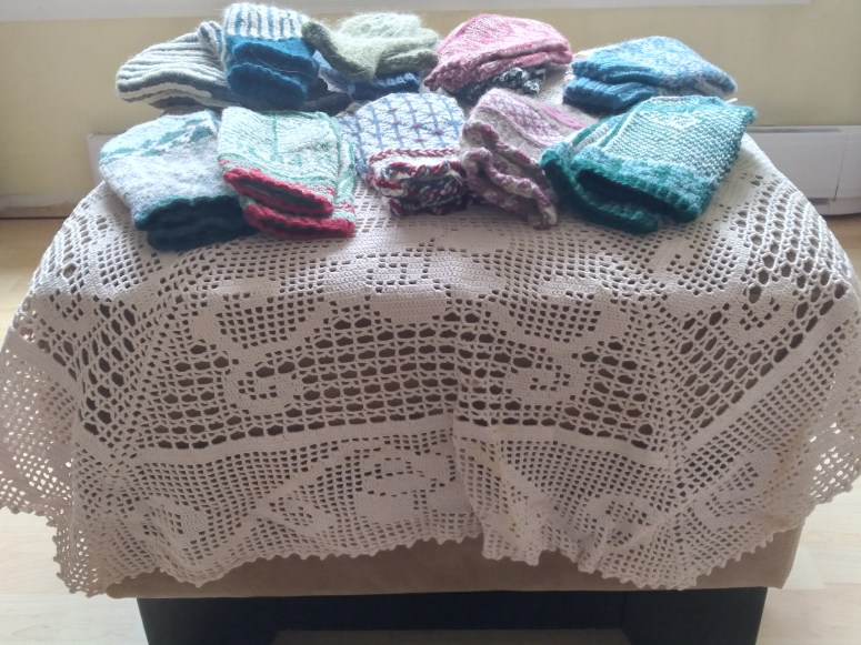 Le travail pour mon livre est un peu suspendu. Je suis incapable de lui trouver du temps présentement. Les tests sont faits, mais c’est la partie édition (que je fais différemment des autres fois) qui me pèse et qui s’étire. C’est certain qu’il va y avoir quelque chose, ne serait-ce qu’une série de patrons de mitaines, peut-être publiés en une collection, mais il faut que ça se termine cette année.