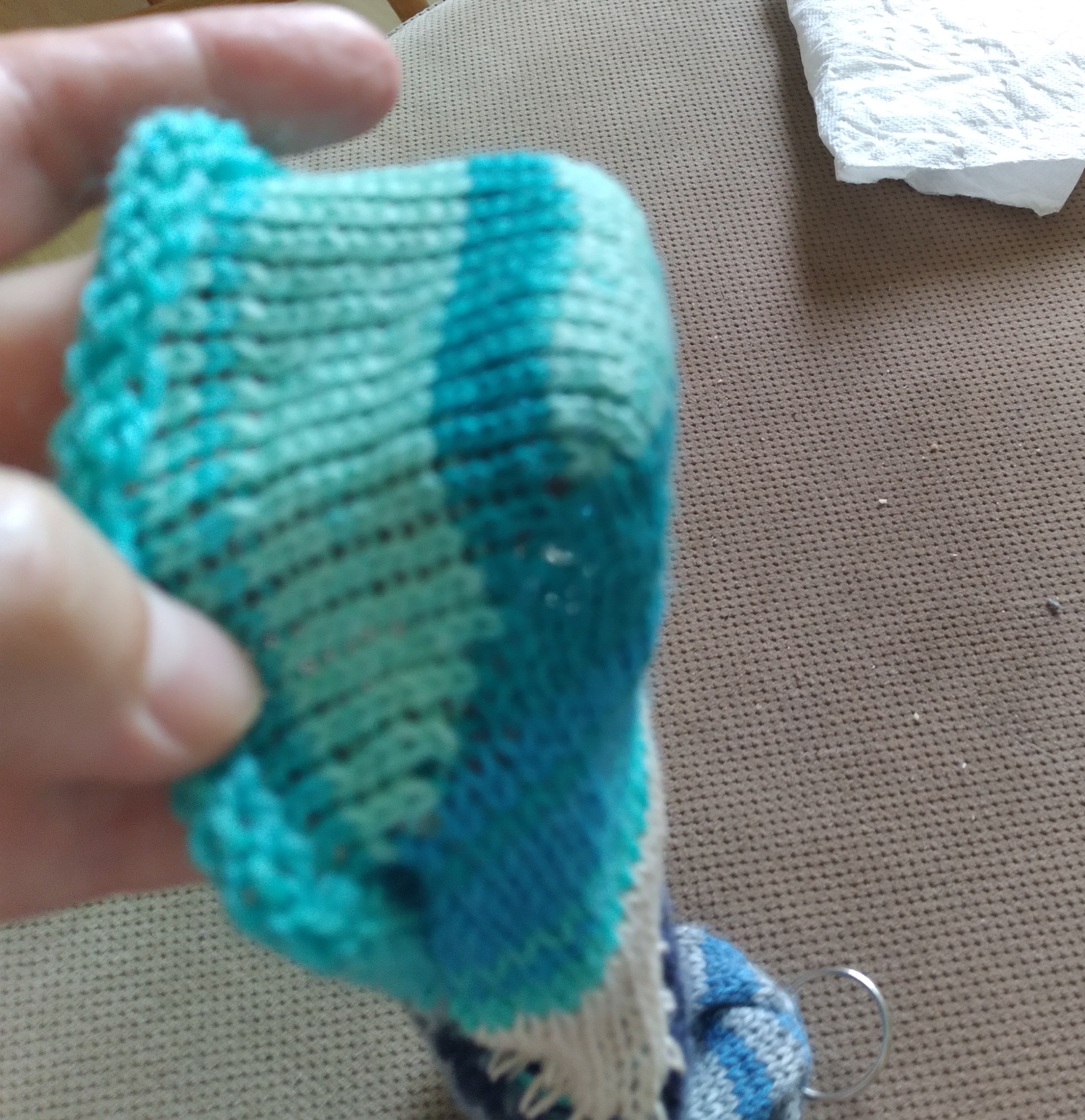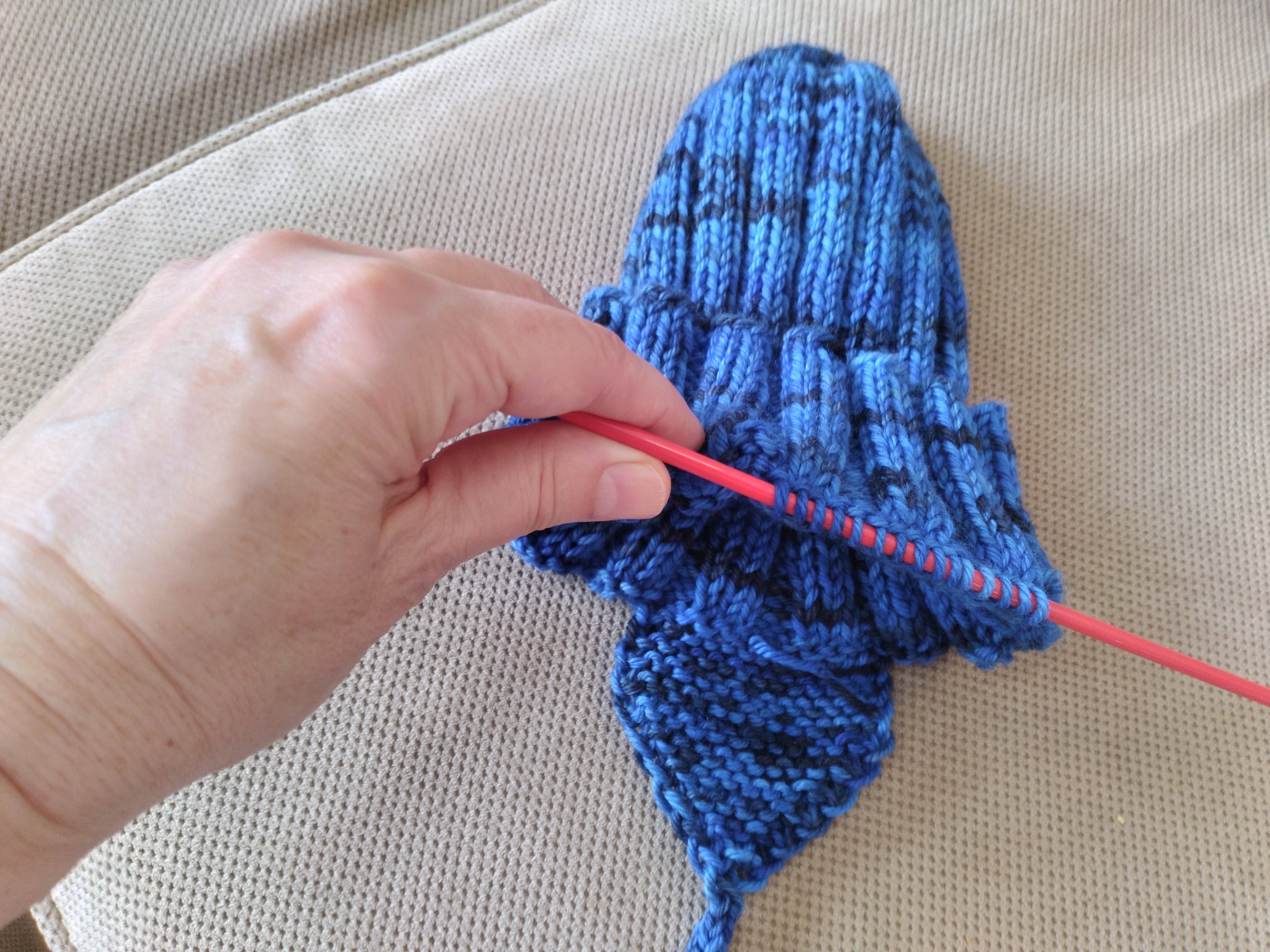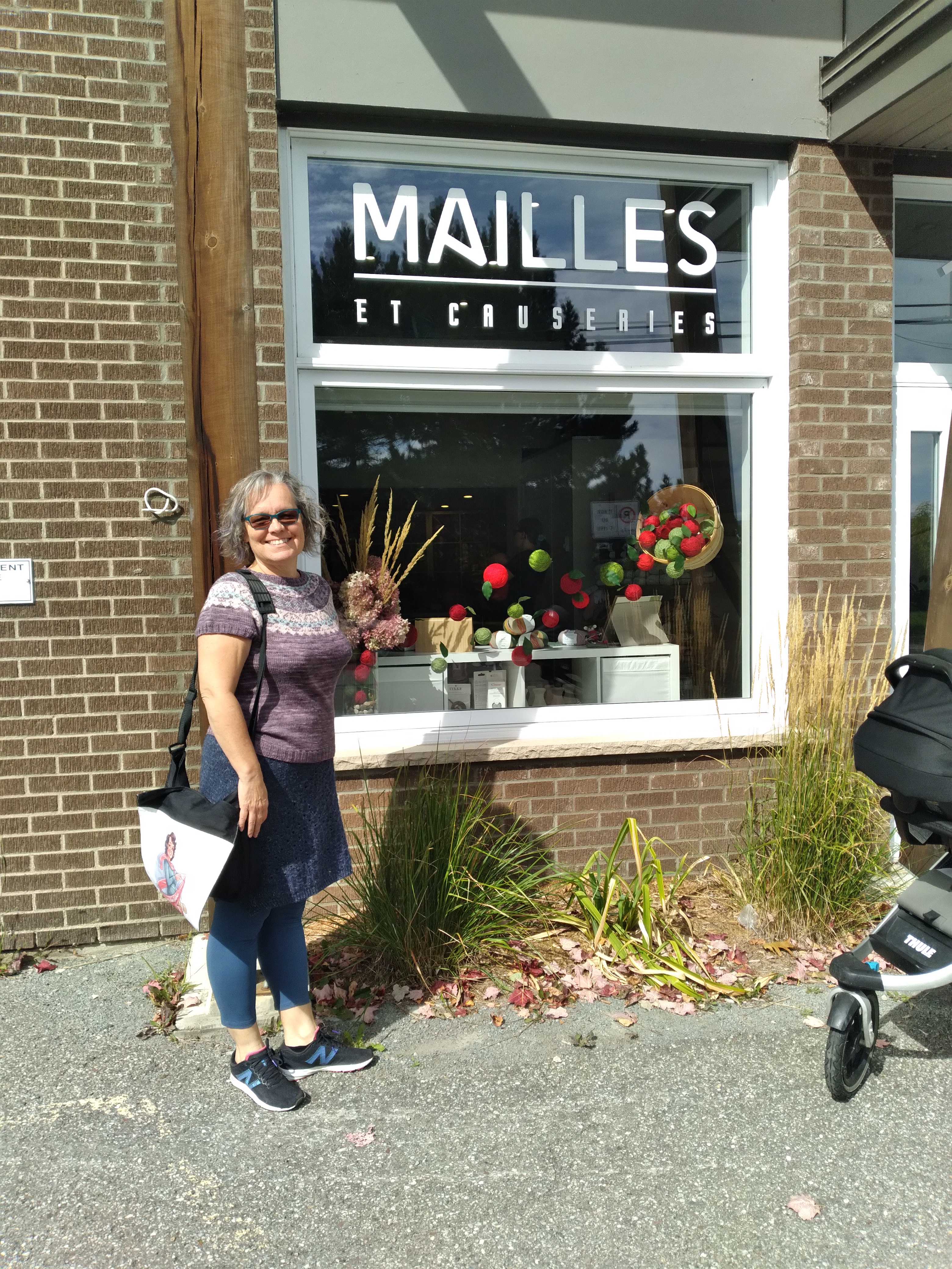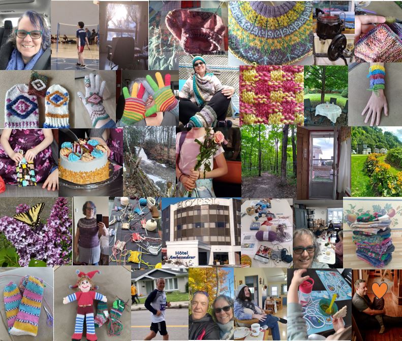 C’est la période des vacances, avec 2 séjours dans un chalet que nous louons presque tous les étés depuis 2014. J’ai acquis une CSM (circular sock machine: une machine circulaire pour faire des bas). Je suis LOIN de la maîtriser, mais je m’amuse avec elle et progresse tout de même un peu. J’ai écrit un petit article sur les moments parfaits, et nous avons eu la visite de mes grands petits-enfants (M et L, 15 et 13 ans). Ma petite L a commencé à apprendre à tricoter!!! Je suis super fière! Et, finalement, j’ai publié ce qui allait être mon patron des bas de l’Anse (un des modèles qui avaient été proposés dans le groupe Panier à Tricot).