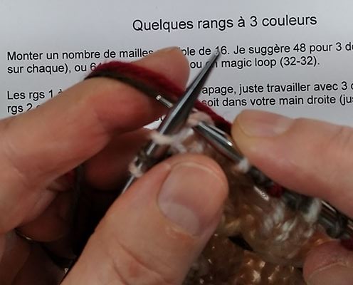 Petit conseil si vous prévoyez en faire sur plusieurs rangs: Déterminez la couleur de droite (la principale ou le fond), la couleur de gauche (la contrastante ou la dominante), et la couleur du centre (votre 3ème couleur) et en tricotant, veillez à ce que celle de droite soit au-dessus et celle de gauche en-dessous (c’était déjà ça en utilisant le méthode à 2 main). Et celle du centre devra être sous celle de droite mais par-dessus celle de gauche. Ceci afin d’avoir, encore, une certaine constance dans votre tricot (qui paraît à l’avant-plan). Dans le cas de très peu de rangs, c’est moins primordial: là c’est moi qui dit ça (pour l’instant, je ne m’en préoccupe pas trop).