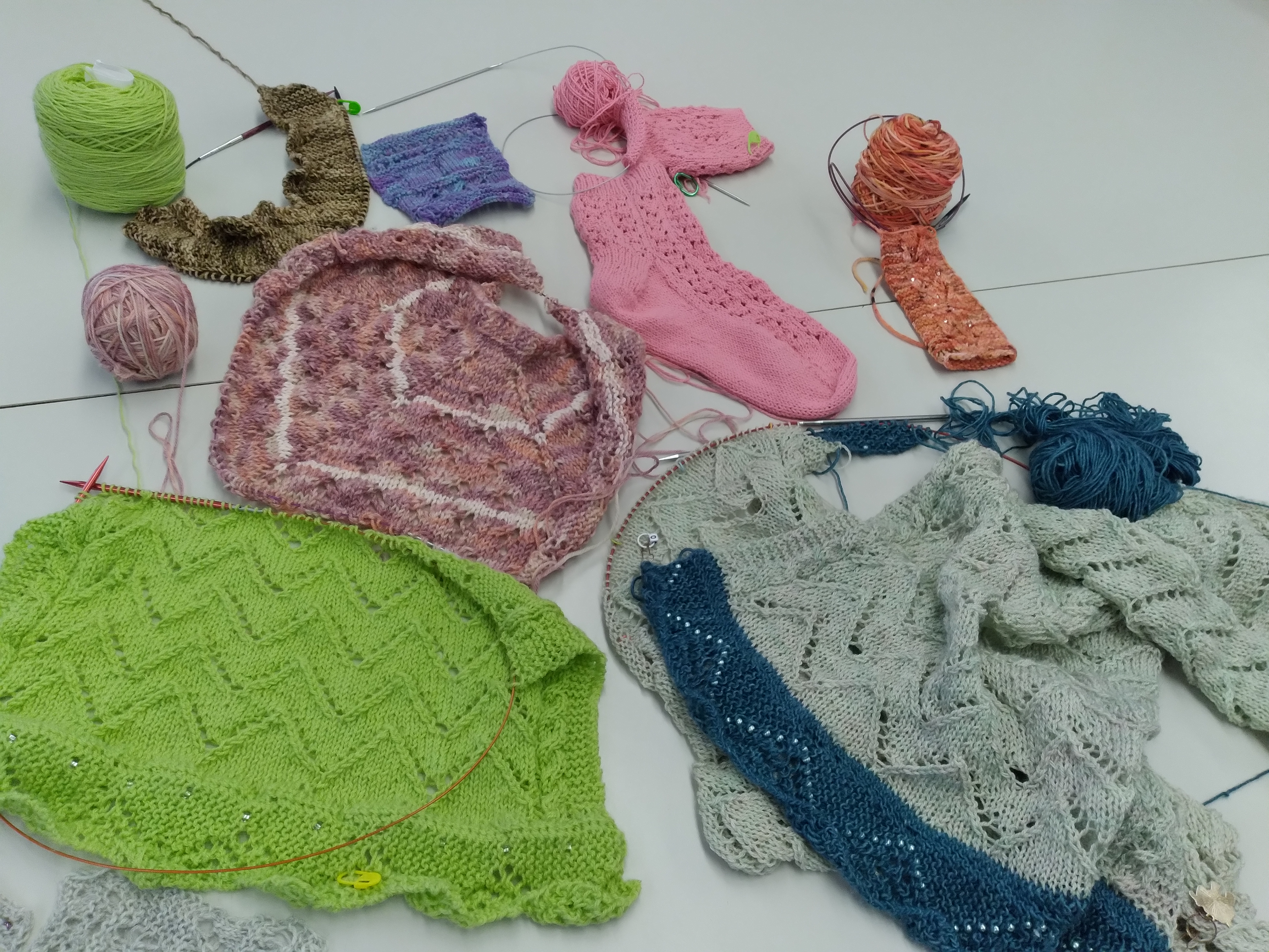 Et à droite, à la fin d’un cours sur le tricot ajouré (mars et avril 2025) à la Maison Routhier.