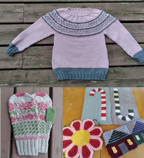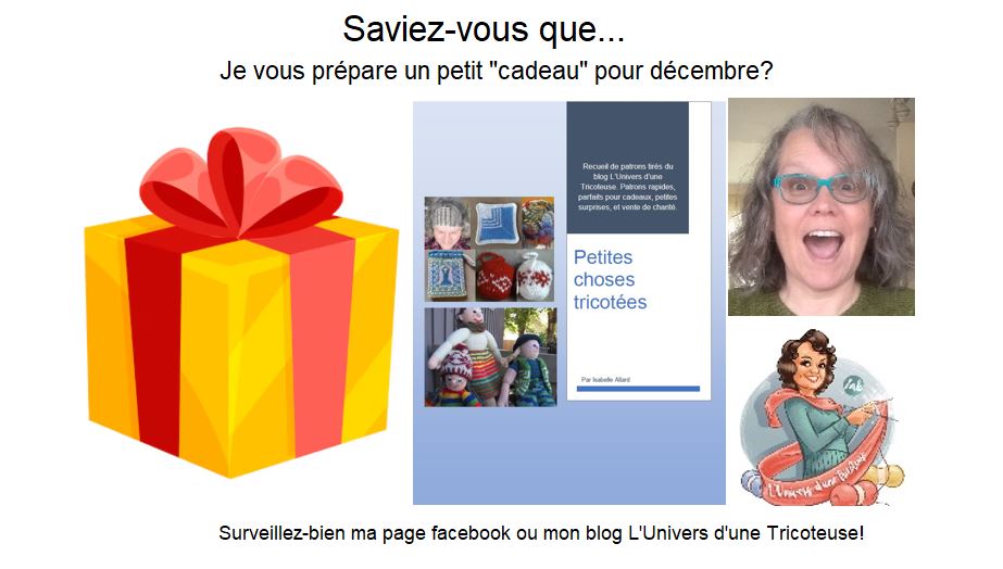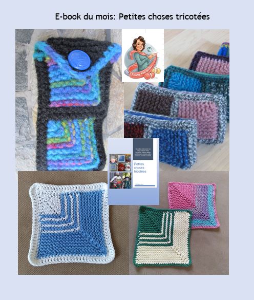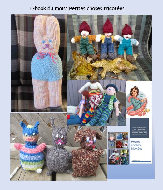 Mais surtout, je veux vous annoncer la disponibilité de mon livret virtuel « Petites choses tricotées ». Il est gratuit. Vous pouvez le voir en déroulant cette page de mon blog, en bas à droite. En cliquant sur la même image que celle au centre du collage en-dessous, ça ouvre le livre. Ne vous reste qu’à le télécharger.