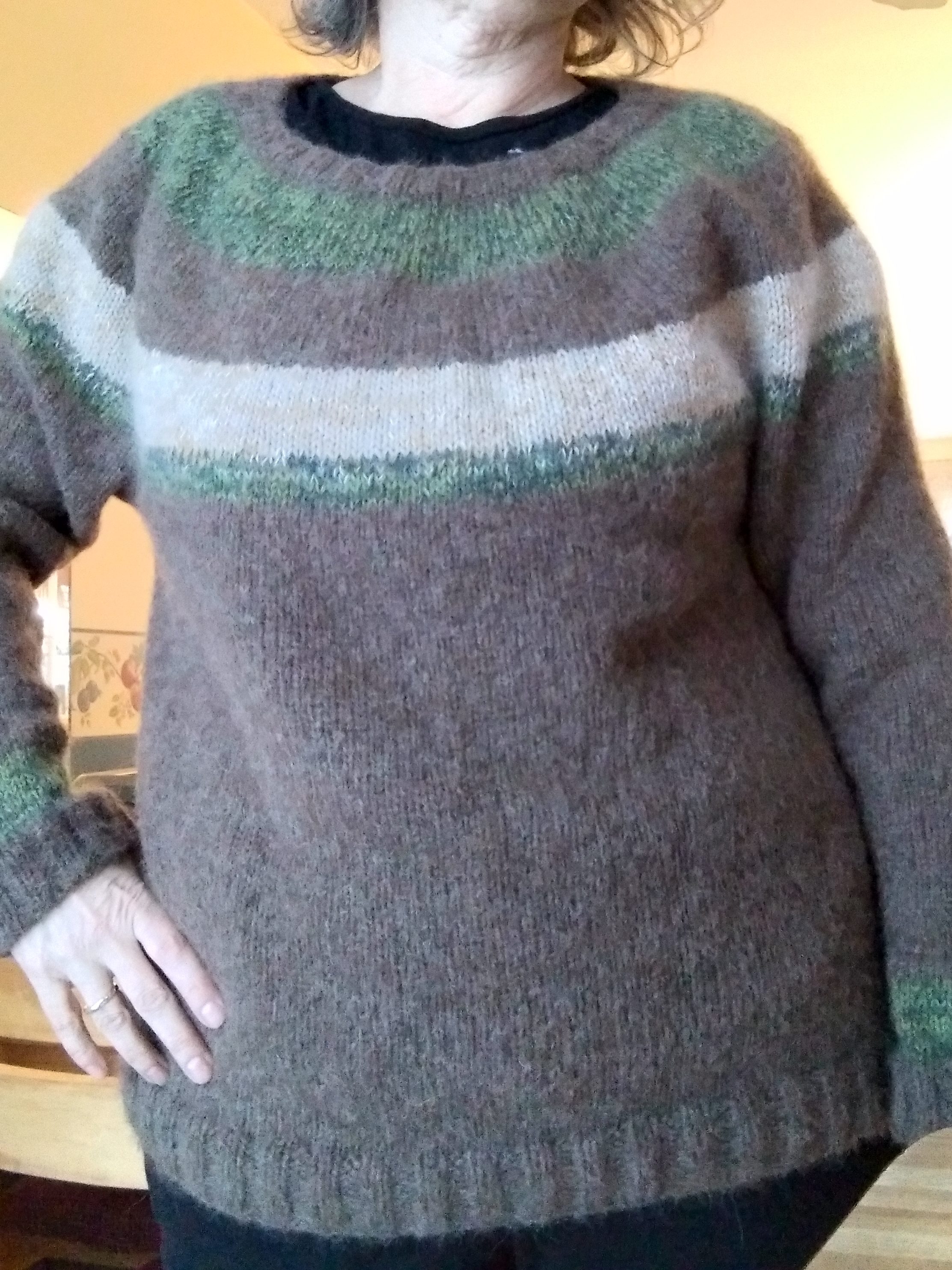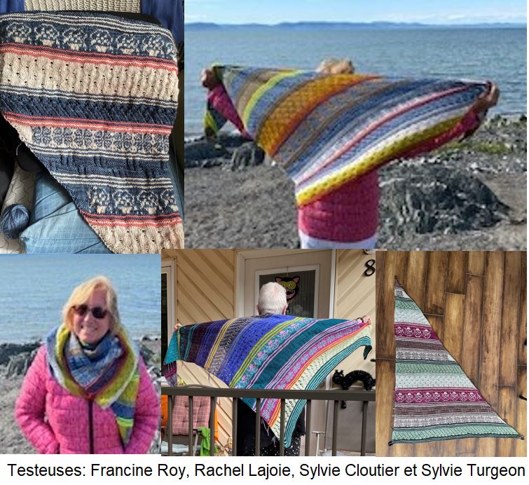 Comme vous pouvez le voir par les oeuvres de quelques testeuses, c’est aussi un projet idéal pour passer des restes de laine. Tout ce que vous devez faire, c’est classer vos laines comme pâle, foncée ou vive. Pour la (ou les) couleur(s) vive(s), ce sont de toutes petites touches, donc en très petite quantité. C’est la foncée qui en demande le plus: un peu plus de 100 g pour la version plus grande, et presque 100 g pour le plus petit. Pour la couleur pâle, petit ou grand, ce sera 100 g et moins. À moins que vous ne le vouliez « géant ». Car oui, c’est possible de le faire plus grand encore que les 2 tailles proposées.