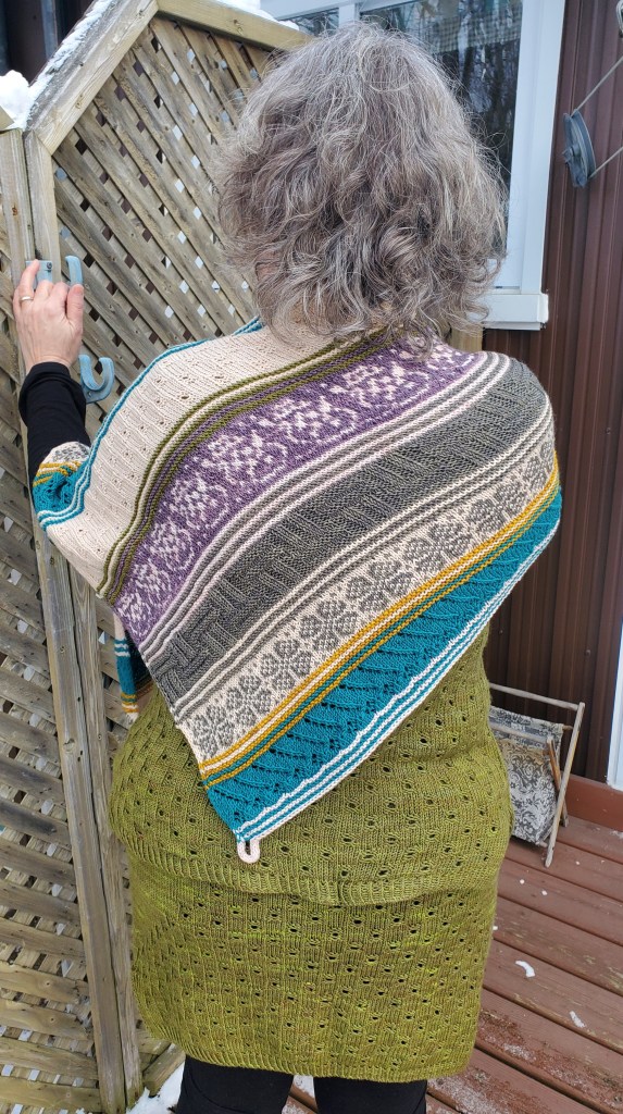 J’ai parlé de 3 morceaux (incluant le châle)? Les voici sur la photo ici-bas: châle, bonnet et jambières. Pour les jambières, ça s’en vient, mais pour le bonnet, je vais attendre à l’automne, histoire que j’en tricote un autre moi-même.