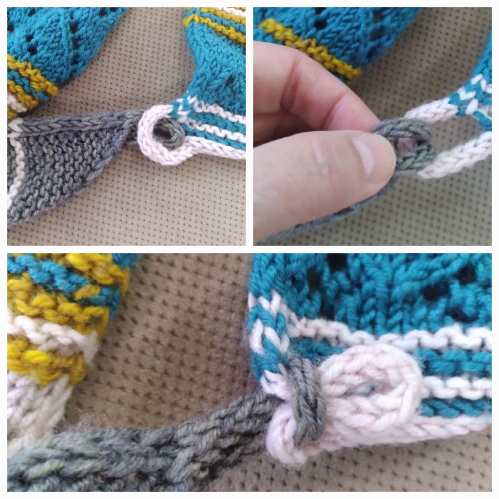 Il y a une finition un peu spéciale: 3 anneaux de laine faits à l’aide de petits bouts de corde en « i ». C’est un peu un complément de la bordure et du rabattage en corde en « i ». Et je leur ai trouvé une utilité: celle de tenir le châle attaché, comme on le voit sur le collage ci-dessous.